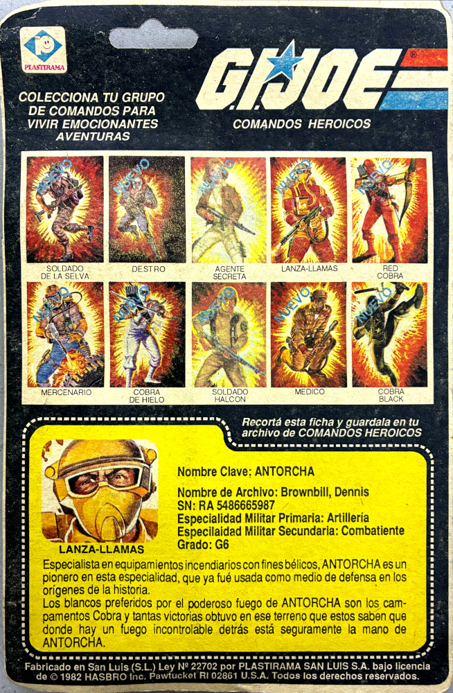 O Antorcha poderia ser encontrado com o capacete que originalmente vinha com o Doc e a arma do Torch, ou com o capacete padrão de 1982 (vinha, por exemplo com o Grunt) e a arma do Torch, ou o capacete do Doc e a arma do Rip Cord.