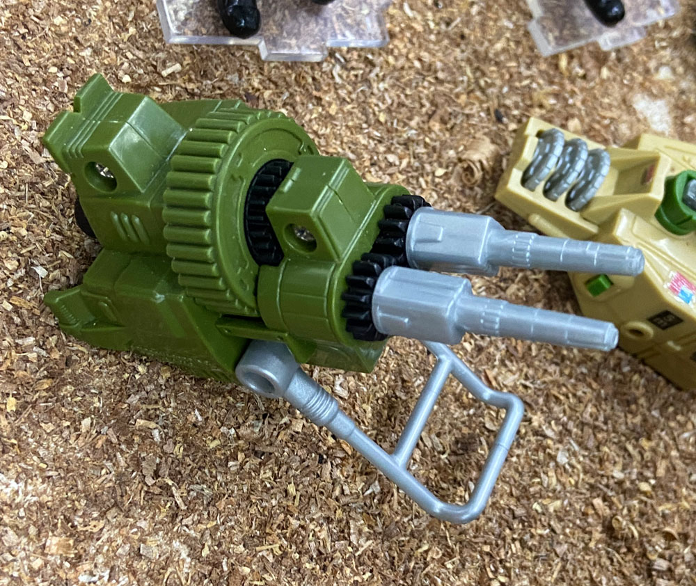 Informações Adicionais: O G.I. Joe Double Machine Gun era parte do Action Pack (Pacote de Ação), que eram armas ou dispositivos relativamente pequenos, comercializados em cartelas semelhantes às dos bonecos.