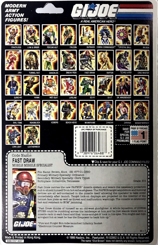 “Fast Draw pensa em si mesmo como um pistoleiro do velho oeste. Um esquadrão inteiro de STUNS do COBRA pode estar cruzando a paisagem em sua direção e ele só fica lá parado com um rack de mísseis em cada mão e aquele olhar de ‘vem me pegar’ nos olhos. Você pode até chama-lo de arrogante, mas ele tem o poder de fogo para se garantir.”