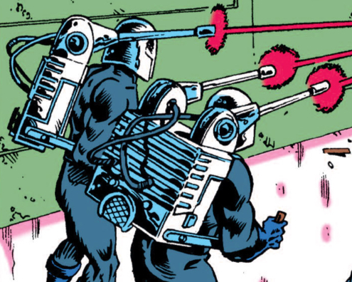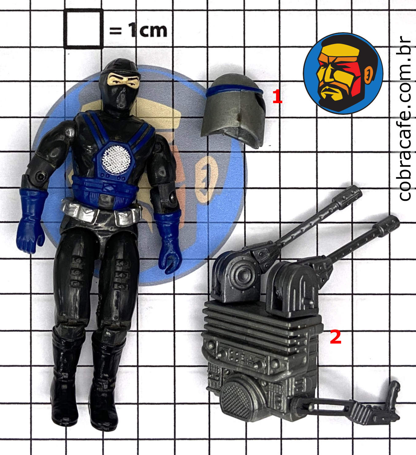 - 1 mochila prateada com um braço para controle e 2 armas laser compostas de uma base e um cano desmontáveis
