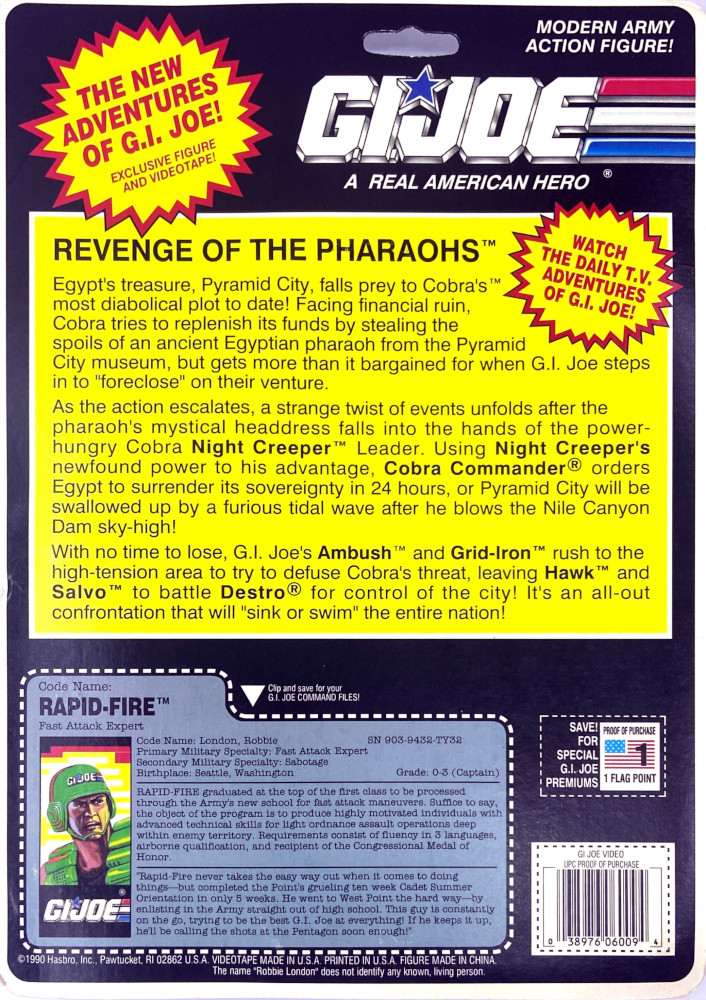 Informações Adicionais: Junto a Rapid Fire, vinha grátis uma fita VHS com o episódio A Vingança dos Faraós, da série animada G.I. Joe – A Real American Hero, da DIC. O nome de arquivo do personagem é uma homenagem ao produtor-executivo do desenho na época, Robbie London.