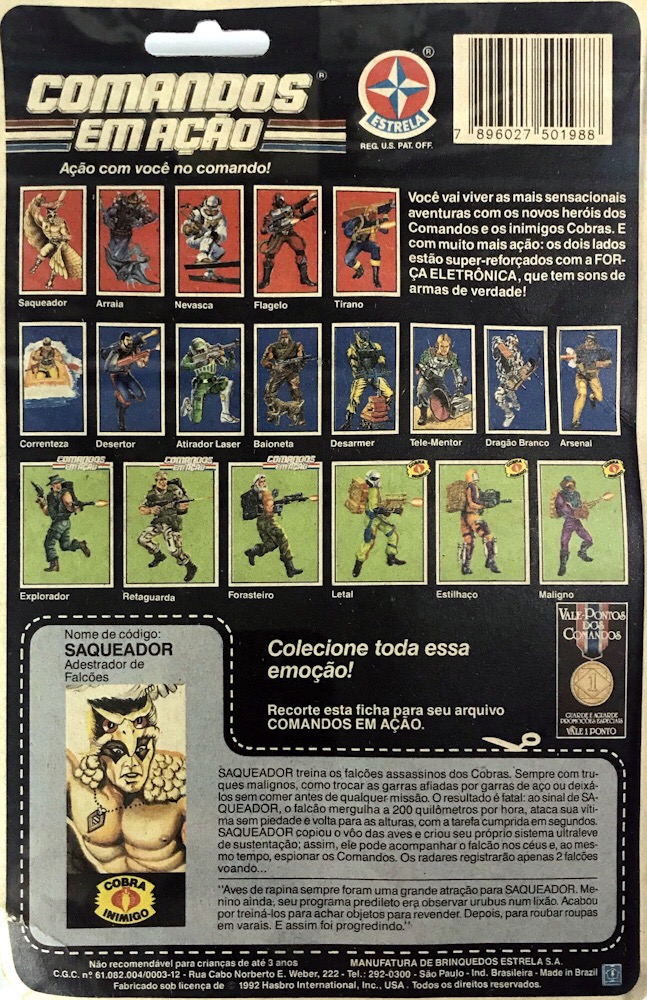 SAQUEADOR treina os falcões assassinos dos Cobras. Sempre com truques malignos, como trocar as garras afiadas por garras de aço ou deixa-los sem comer antes de qualquer missão. O resultado é fatal: ao sinal de SAQUEADOR, o falcão mergulha a 200 quilômetros por hora, ataca sua vítima sem piedade e volta para as alturas, com a tarefa cumprida em segundos. SAQUEADOR copiou o voo das aves e criou seu próprio sistema ultraleve de sustentação: assim, ele pode acompanhar o falcão nos céus e, ao mesmo tempo, espionar os Comandos. Os radares registrarão apenas dois falcões voando.
