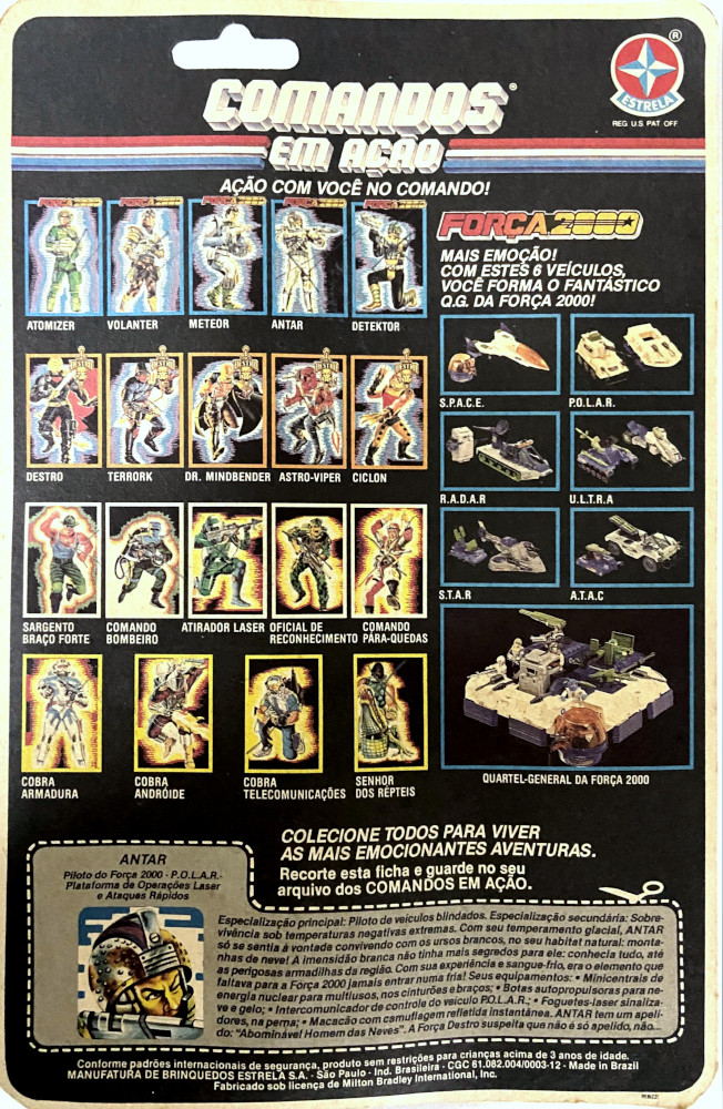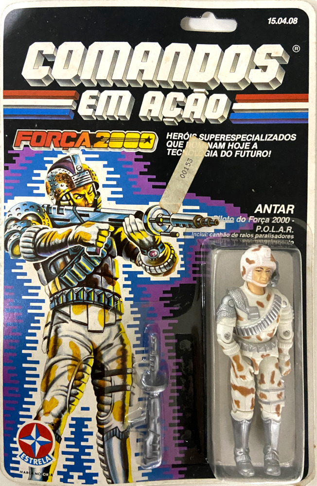 Especialização principal: Piloto de veículos blindados. Especialização secundária: Sobrevivência sob temperaturas negativas extremas. Com seu temperamento glacial, ANTAR só se sentia à vontade convivendo com os ursos brancos, no seu habitat natural: montanhas de neve! A imensidão branca não tinha mais segredos para ele: conhecia tudo, até as perigosas armadilhas da região. Com sua experiência e sangue-frio, ele era o elemento que faltava para a Força 2000 jamais entrar numa fria! Seus equipamentos: • Botas propulsoras para neve e gelo; • Macacão com camuflagem refletida instantânea. Antar tem um apelido: Abominável Homem das Neves”. A Força Destro suspeita que não é só apelido, não…