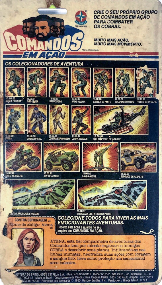 ATENA, esta fiel companheira de aventuras dos Comandos tem por missão enganar os inimigos COBRA e descobrir seus planos. Infiltrando-se nas linhas inimigas, neutraliza suas ações, com coragem e sangue frio. Leva como proteção um sensacional arco-balestra.