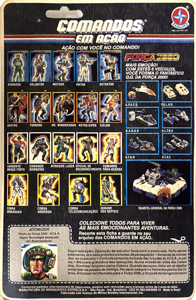 Especialização: Condução de veículos tipo hovercraft e efeito-ação. Perito em rastreamento, tem seus próprios sistemas de perseguição: ● Sensores de microondas no capacete; ● Controle computadorizado das funções do S.T.A.R., na perna; ● Máscara gravadora das operações. Numa missão de rotina dos Comandos, Atomizer foi preso pelos Cobras. Quando escapou, tinha um só objetivo: antecipar os passos do inimigo. Por estar sempre na frente dos planos dos Cobras, Atomizer foi chamado para a Força 2000, a força da tecnologia do futuro!