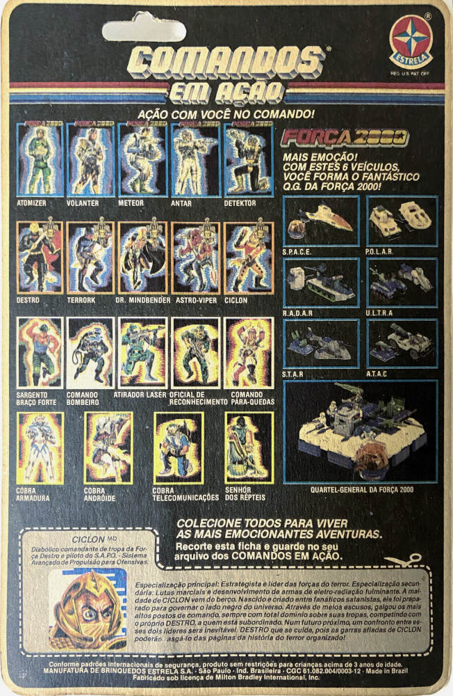Especialização principal: Estrategista e lider das forças do terror. Especialização secundária: Lutas marciais e desenvolvimento de armas de eletro-radiação fulminante. A maldade de CICLON vem do berço. Nascido e criado entre fanáticos satanistas, ele foi preparado para governar o lado negro do universo. Através de meios escusos, galgou os mais altos postos de comando, sempre com total domínio sobre suas tropas, competindo com o próprio DESTRO, a quem está subordinado. Num futuro proximo, um confronto entre os seus dois lideres será inevitável. DESTRO que se cuide, pois as garras afiadas de CICLON poderão rasgá-lo das paginas da história do terror organizado!