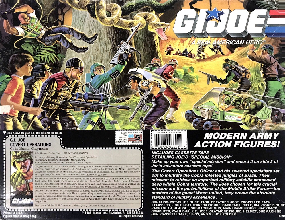 Informações Adicionais: Claymore é o único personagem origial do kit Special Missions: Brazil, que era comercializado exclusivamente pela rede de lojas Toys R Us nos EUA. Suas peças eram reaproveitadas de Footloose (cabeça), Tele-Vipers (torso e braços), Flint (quadril) e Dusty (pernas).