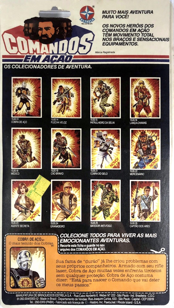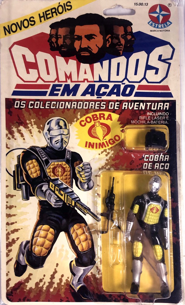 Informações Adicionais: Embora o primeiro boneco exclusivo da Estrela seja o Falcon Piloto, o mais celebrado é certamente o Cobra de Aço. Primeiro boneco cartelado vendido só no Brasil, uma unidade lacrada e bem conservada chegou a custar por volta de US$ 3.000,00 no início dos anos 2000 no eBay. Hoje é mais comum encontrar, e o preço caiu.