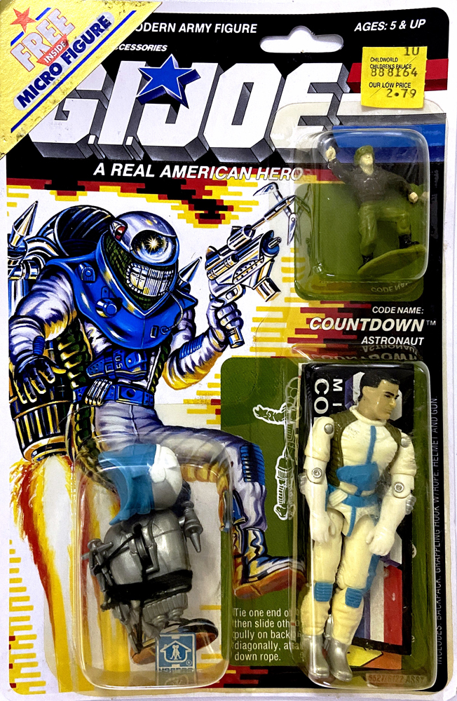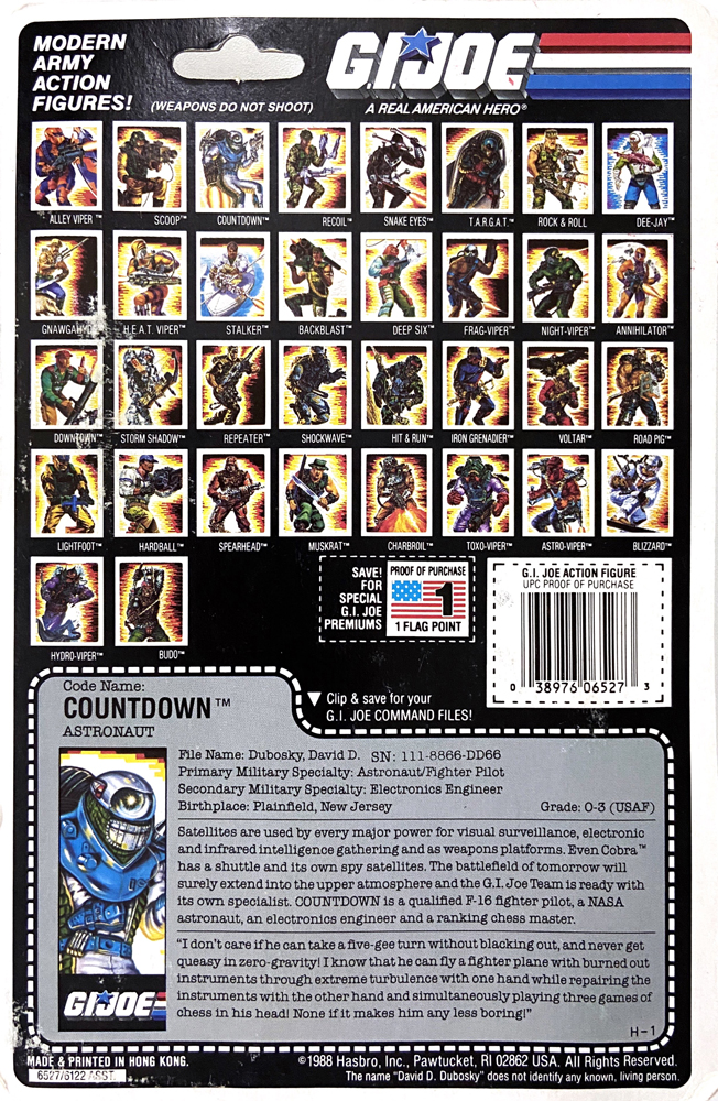 Satélites são usados por todas as grandes potências para vigilância visual, coleta de dados de inteligência eletrônica a e por infravermelho e plataformas de armas. Até o Cobra tem uma nave e seus próprios satélites espiões. O campo de batalha do amanhã certamente se estenderá à exosfera e a Equipe G.I. Joe está pronta com seu próprio espacialista. COWNTDOWN é um piloto de caça F-16 qualificado, um astronauta da NASA, um engenheiro eletrônico e um mestre enxadrista de nível.