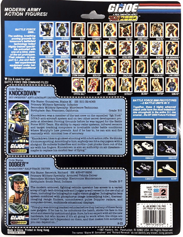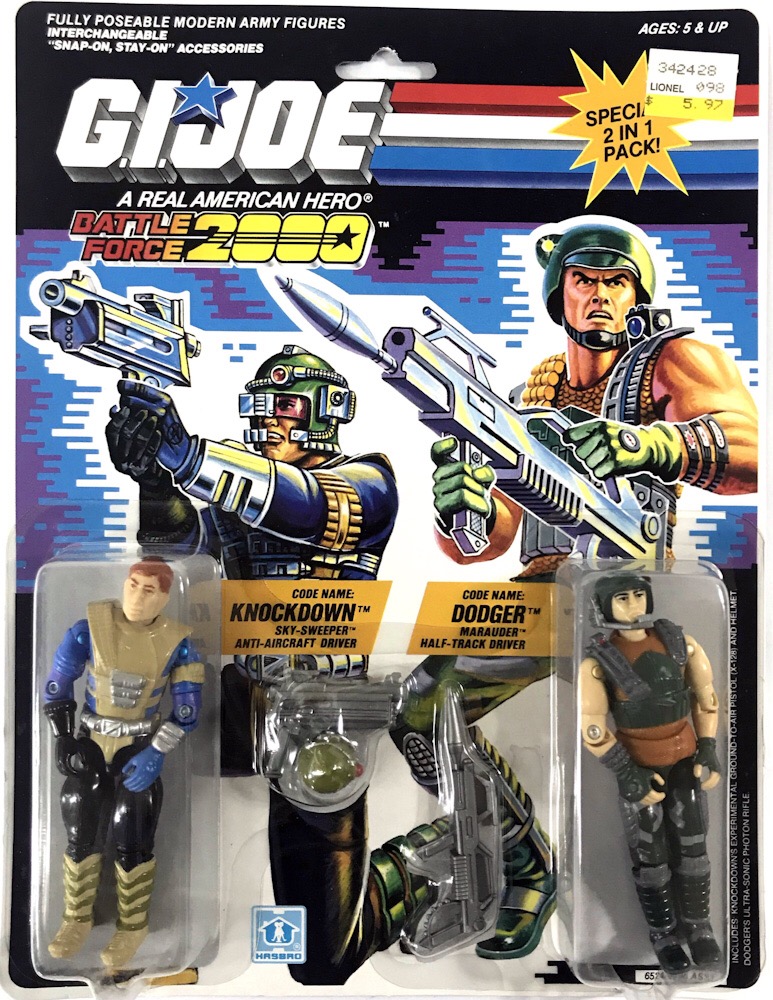 Informações Adicionais: Dodger esteve disponível nas lojas dos EUA no fim de 1987 em cartela individual, motivo pelo qual o site Yojoe.com o considera parte da série seis de G.I. Joe, e acompanharemos este critério. Em 1988, ele também foi vendido acompanhado de seu colega de Battle Force 2000, Knockdown.
