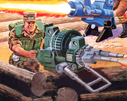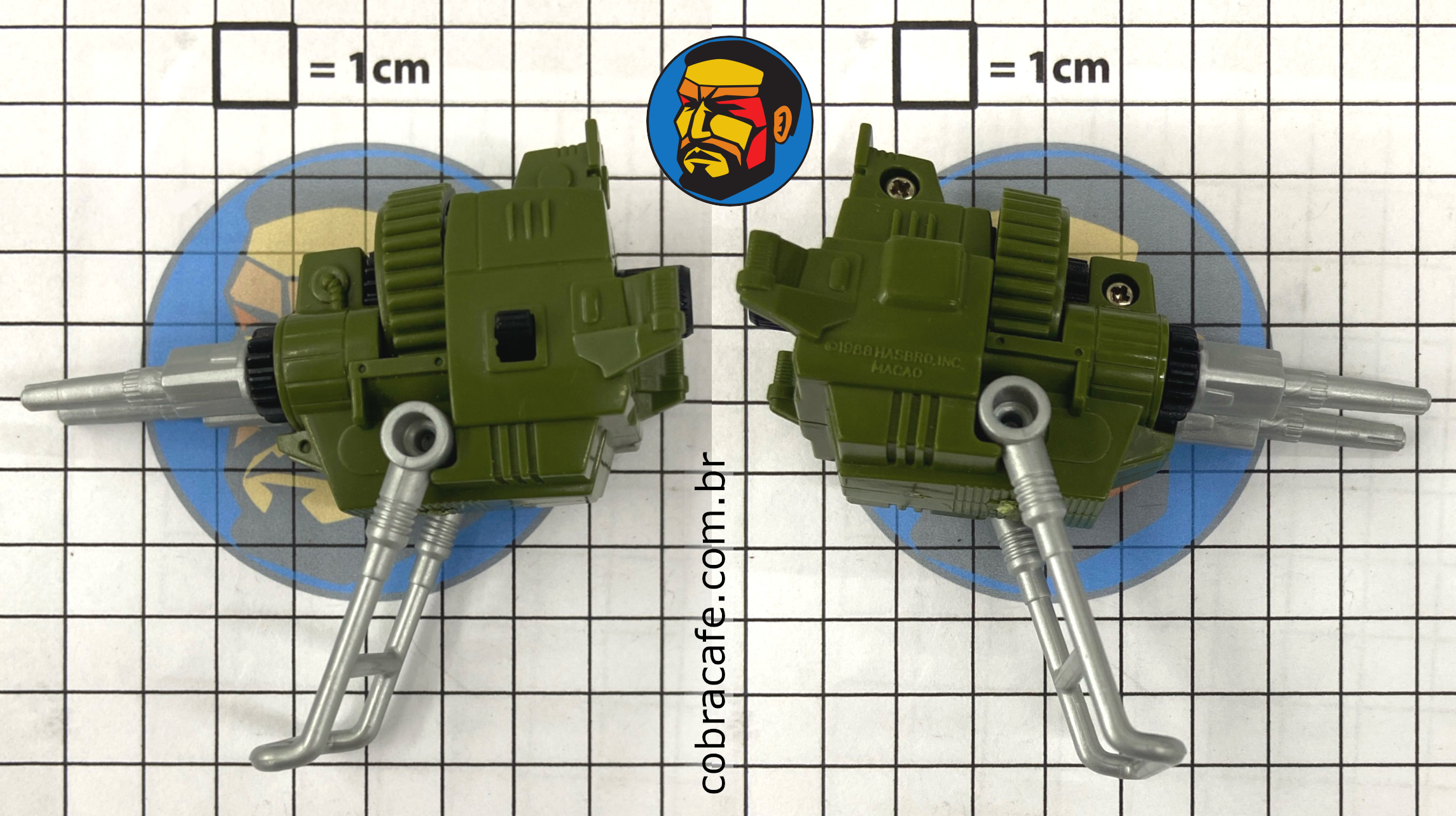 Informações Adicionais: O G.I. Joe Double Machine Gun era parte do Action Pack (Pacote de Ação), que eram armas ou dispositivos relativamente pequenos, comercializados em cartelas semelhantes às dos bonecos.
