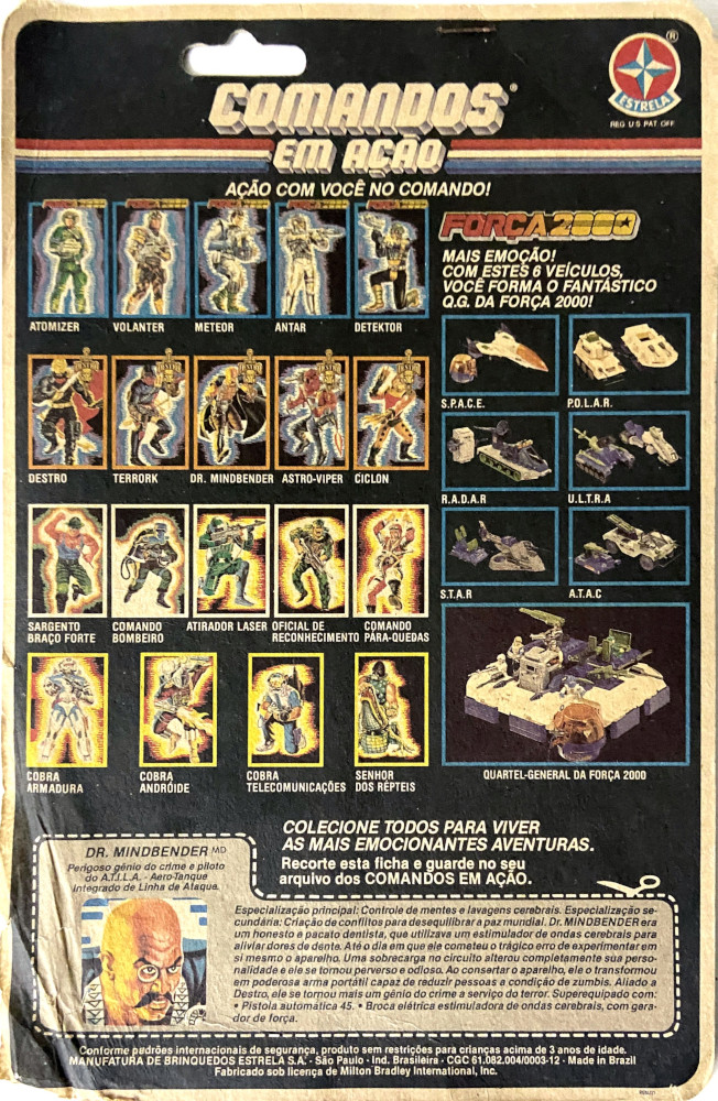 Especialização principal: Controle de mentes e lavagens cerebrais. Especialização secundária: Criação de conflitos para desequilibrar a paz mundial. Dr. MINDBENDER era um honesto e pacato dentista, que utilizava um estimulador de ondas cerebrais para aliviar dores de dente. Até o dia em que cometeu o trágico erro de experimentar em si mesmo o aparelho. Uma sobrecarga no circuito alterou completamente sua personalidade e ele se tomou perverso e odioso. Ao consertar o aparelho, ele o transformou em poderosa arma portátil capaz de reduzir pessoas à condição de zumbis. Aliado a Destro, ele se tornou mais um gênio do crime a serviço do terror. Superequipado com: • Pistola automatica 45. • Broca elétrica estimuladora de ondas cerebrais, com gerador de força.