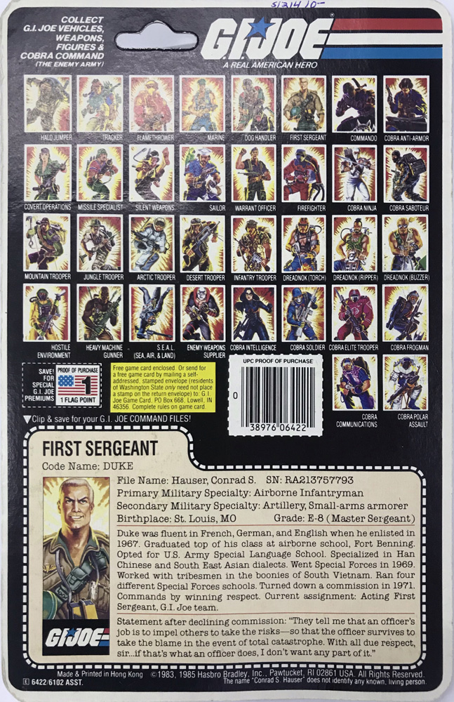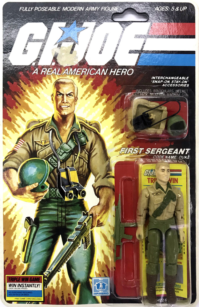 Informações Adicionais: Duke liderou a equipe G.I. Joe na animação da Sunbow até o fim da primeira temporada, e sempre foi um dos principais personagens. Embora seu boneco tenha um sorriso esculpido, o mais normal de sua versão animada era aparecer com a cara amarrada dos chefes durões.