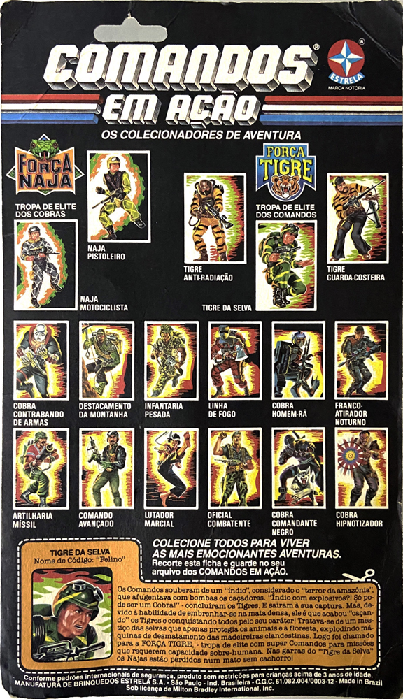 Informações Adicionais: O Felino tinha diferenças substanciais em relação ao Dusty da Tiger Force. Ele não vinha com o forro de pano no capacete, e a camuflagem de tigre se estendia por todo o uniforme ao invés de só a camisa. Essa versão foi vendida com exclusividade no Brasil.