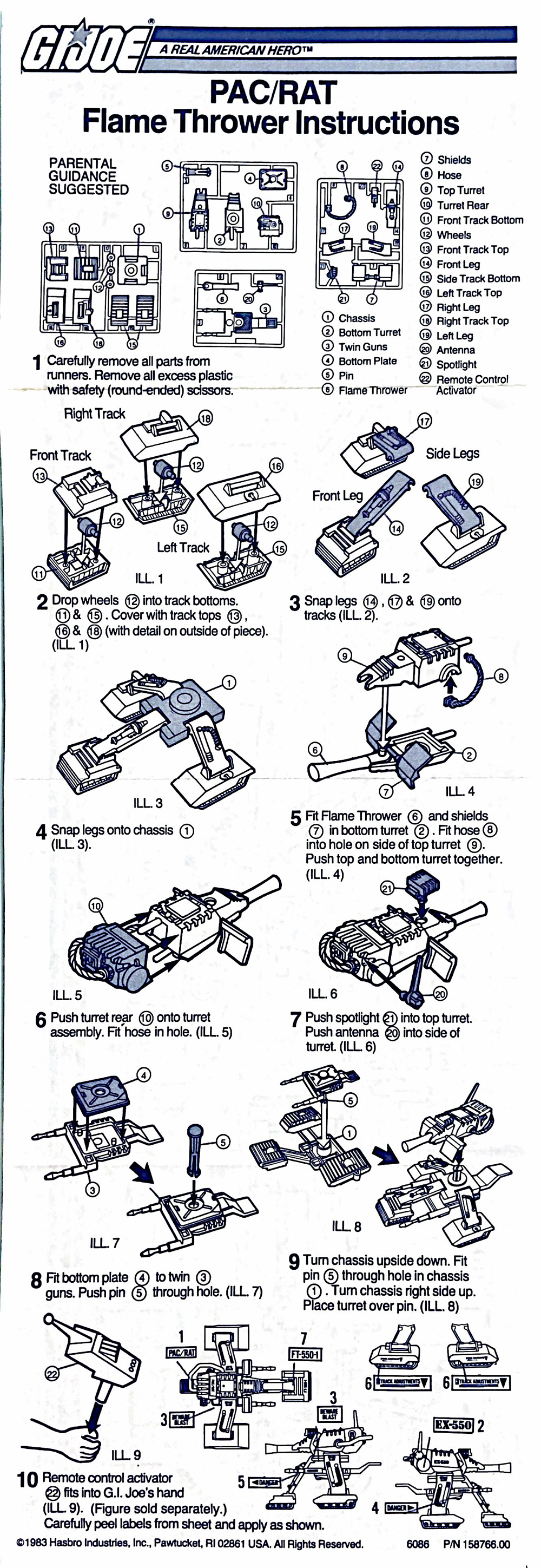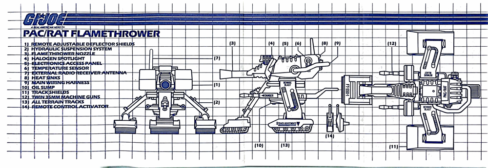 Venda em Conjunto com: O Flame Thrower fazia parte dos PAC/RAT (Programmed Assault Computer/Rapid All Terrain, ou Camputador Programado de Ataque/Rápido em Qualquer Terreno), que era um conjunto de robôs, vendidos separadamente, com uma função específica como descritas nos nomes; nesse caso, era equipado com um lança-chamas.