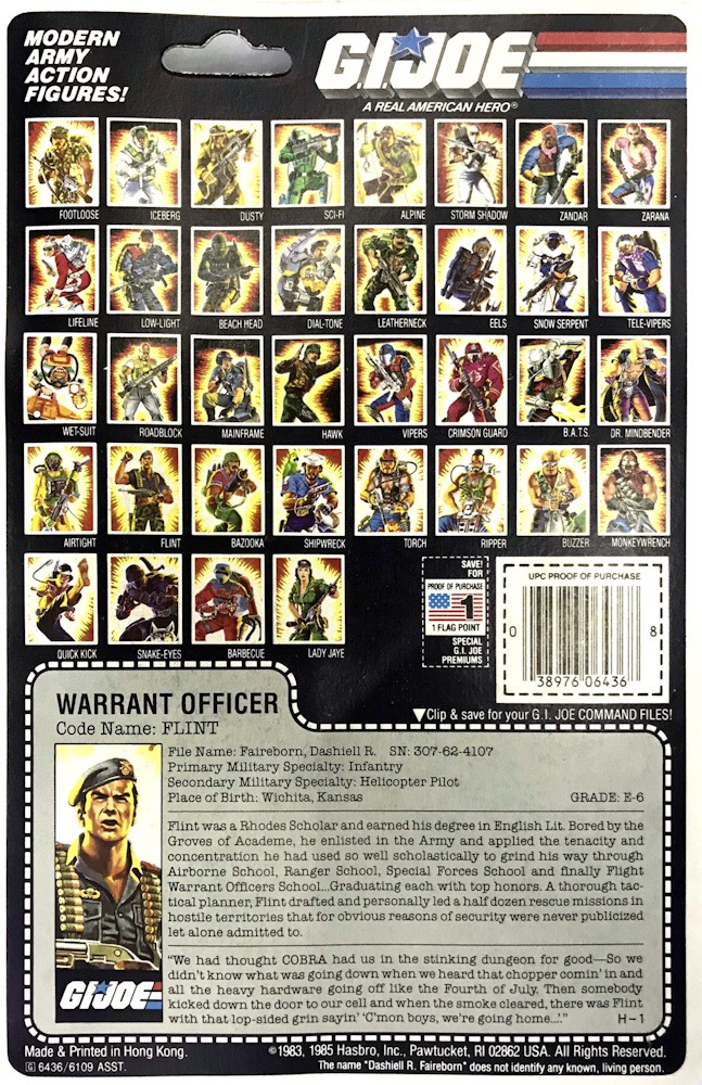 Informações adicionais: Curiosamente, Flint é um antagonista dos Joes nessa versão, mas não é um vilão, principalmente de Duke, com quem tem uma rivalidade. Ele é o responsável no exército por caçar o grupo foragido que foi acusado de crimes que não cometeu.