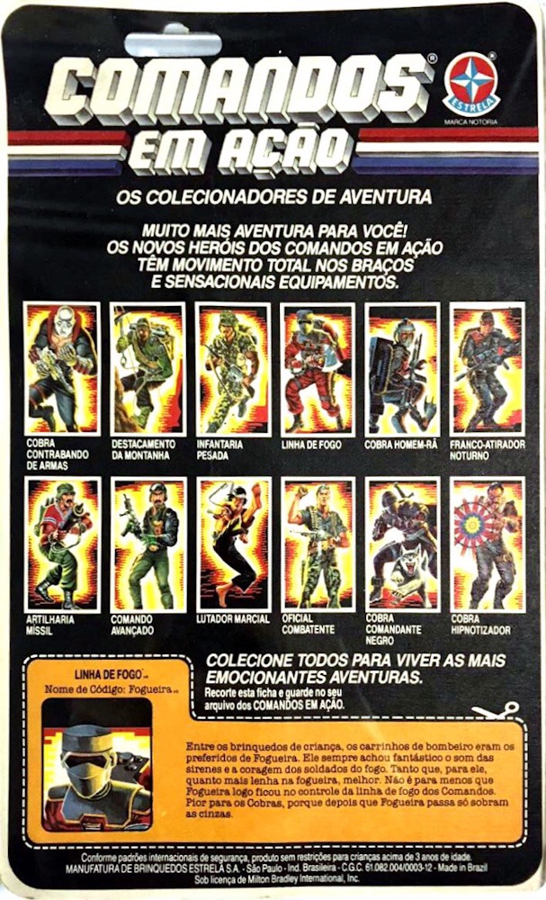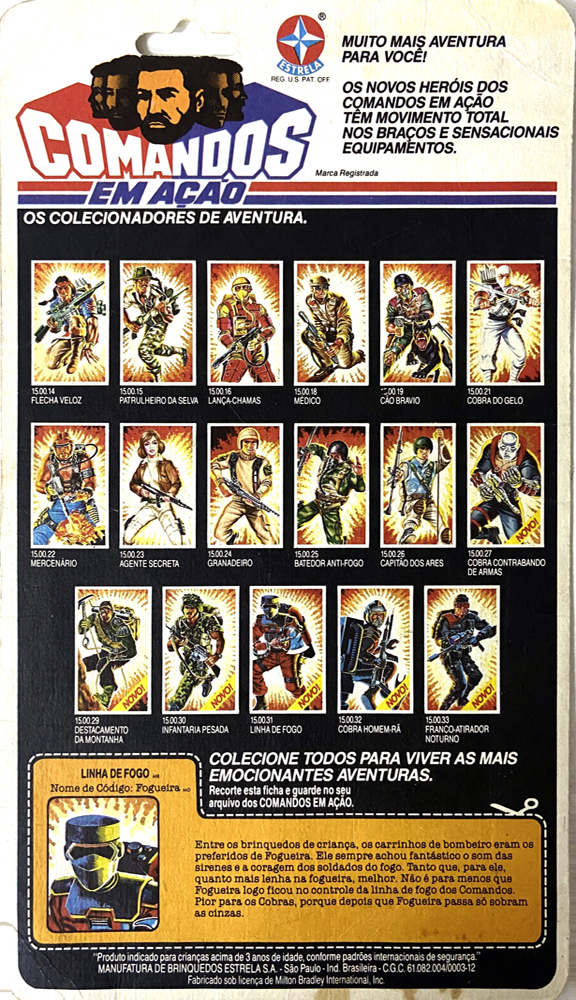 Em 1989, o layout padrão das cartelas dos bonecos do Comandos em Ação mudou, ficando mais parecido com o americano. Como esteve disponível nas lojas em 1988 e 1989, o Fogueira teve as duas versões da embalagem.