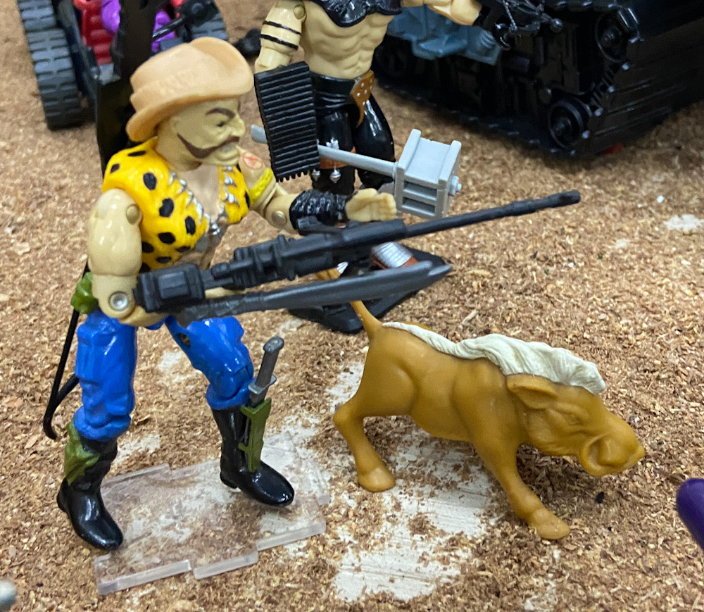 “Ele leva sua caça e rastreamento muito a sério! Gnawhahyde não toma banho por um mês antes de ir para o mato para que os animais não sintam o cheiro de sabonete em seu corpo. Ele se besunta com banha de porco rançosa, e come o que consegue pegar e matar a tiro na natureza. Gnawhahyde faz isso para que os aditivos químicos da comida processada não alterem sua química corporal e assustem os animais com um cheiro humano demais. É bom que ele seja basicamente um anti-social.”