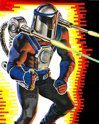 - 1 mochila prateada com um braço para controle e 2 armas laser compostas de uma base e um cano desmontáveis