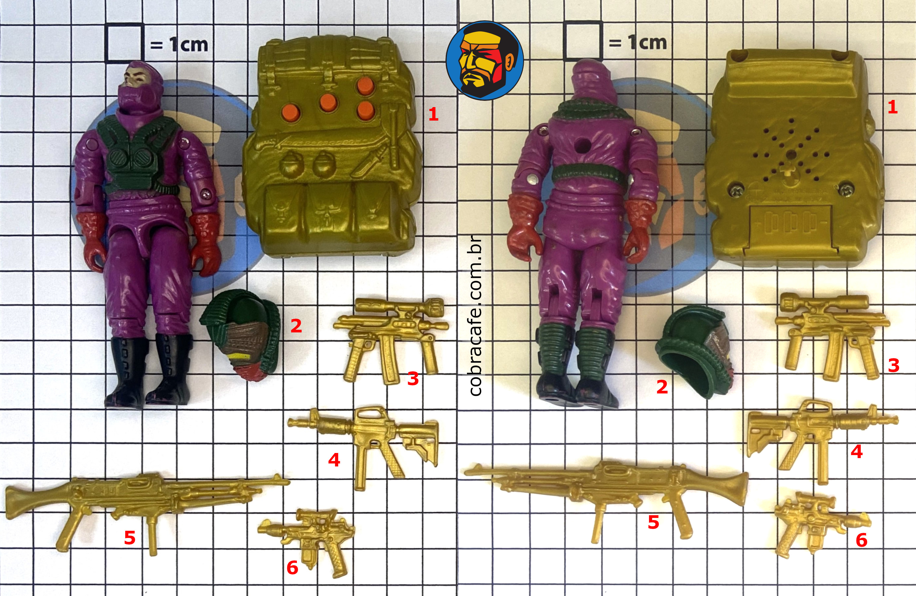 - 1 mochila dourada com botões que emitem sons de batalha
