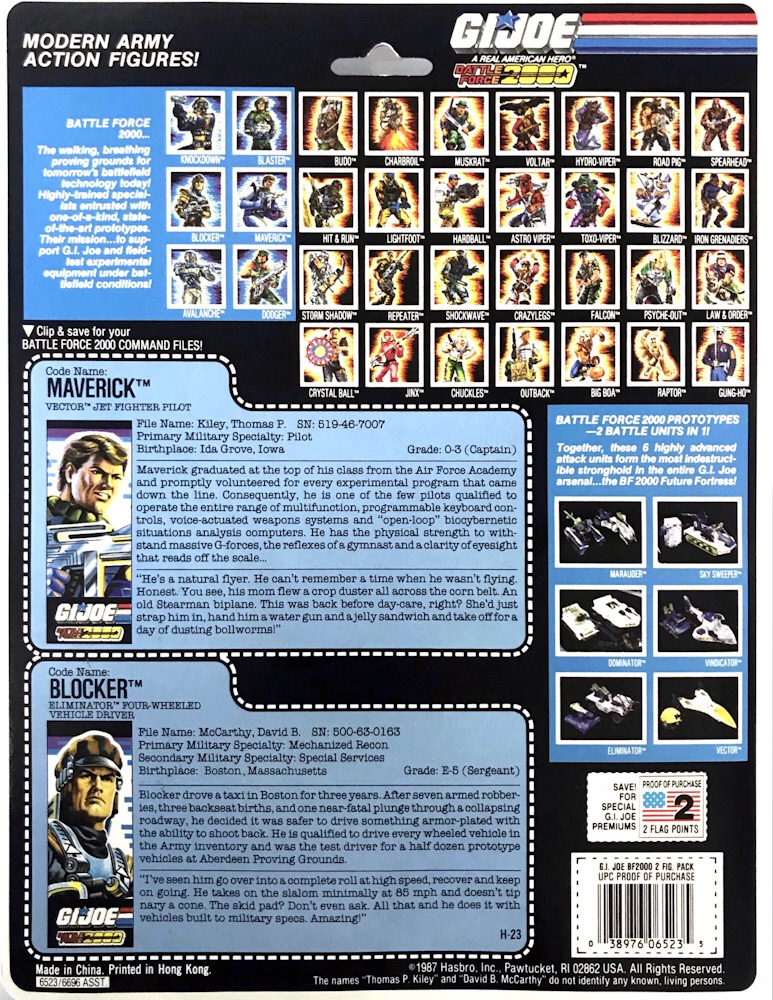 Informações Adicionais: Maverick esteve disponível nas lojas dos EUA no fim de 1987 em cartela individual, motivo pelo qual o site Yojoe.com o considera parte da série seis de G.I. Joe, e acompanharemos este critério. Em 1988, ele também foi vendido acompanhado de seu colega de Battle Force 2000, Blocker.
