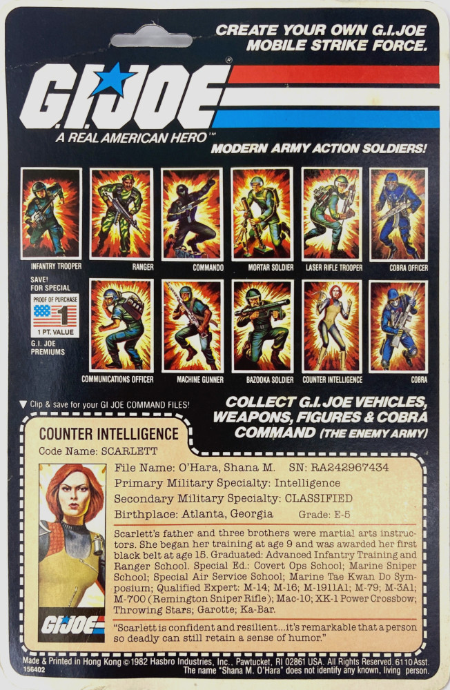 Informações Adicionais: Embora personagens femininas não fossem muito demandadas pelos meninos (Scarlett vinha em quantidade mínima nas caixas fornecidas para as lojas), a ruiva criada em uma família de artes marciais foi um dos personagens mais destacados ao longo de toda a história do G.I. Joe – A Real American Hero e antecipou uma tendência de protagonismo e independência femininos nas mídias em muitos anos, embora não lá sem algumas ressalvas.