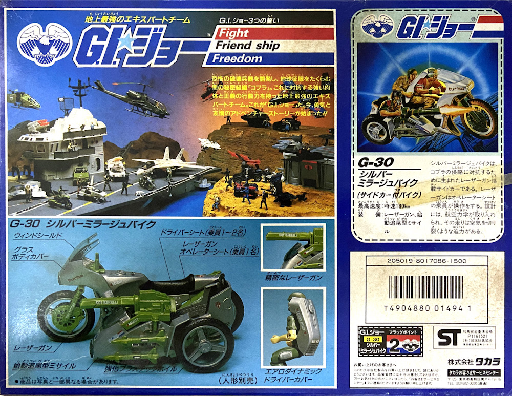 A Silver Mirage Bike é uma motocicleta com sidecar equipada com uma poderosa Arma Laser, criada para enfrentar as invasões da organização Cobra. O canhão a laser é operado pelo tripulante do assento lateral. Seu design incorpora princípios de aerodinâmica, permitindo cortar o ar com impressionante velocidade e precisão.