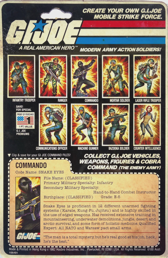Nessa continuidade, Snake-Eyes serviu no Vietnã junto a Stalker e Storm Shadow. Quando voltou para os EUA, ele descobriu que sua irmã gêmea e seus pais haviam morrido em um acidente de carro.