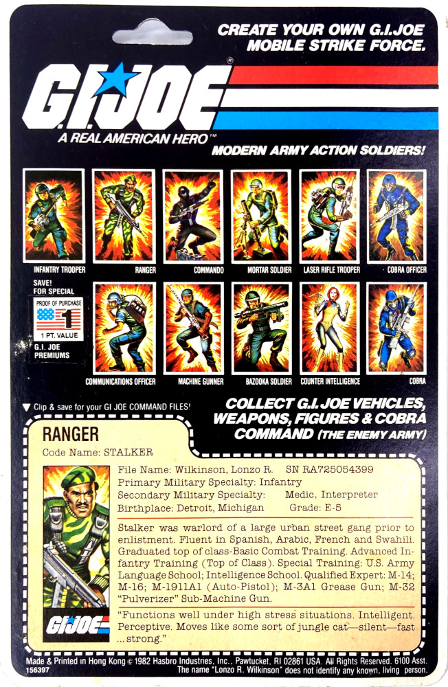 Stalker era líder de uma grande gangue de rua antes de se alistar. É fluente em espanhol, árabe, francês e swahili. Formou-se como primeiro da turma em Treinamento Básico de Combate. Treinamento Avançado de Infantaria (primeiro da turma). Treinamento Especial: Escola de Idiomas do Exército dos EUA; Escola de Inteligência. Perito Qualificado: M-14; M-16; M-1911A1 (Pistola Automática); “Pistola de Graxa” M-3A1; Sub-metralhadora M-32 “A Pulverizadora”.
