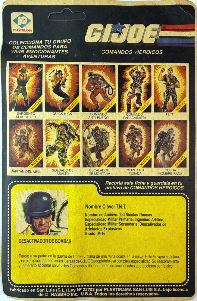 Informações Adicionais: Esse é um boneco exclusivo da Argentina, montado com os mesmos moldes do Blowtorch, mas com cores diferentes. Ele fazia parte de uma promoção que, ao se levar o Cobra Mamba, o Cobra Rattler, a Cobra Hidronave ou o Transporte Táctico Anfíbio, o cliente poderia levar também o TNT em sua cartela (ele não era embalado junto aos veículos, mas sim oferecido como brinde).