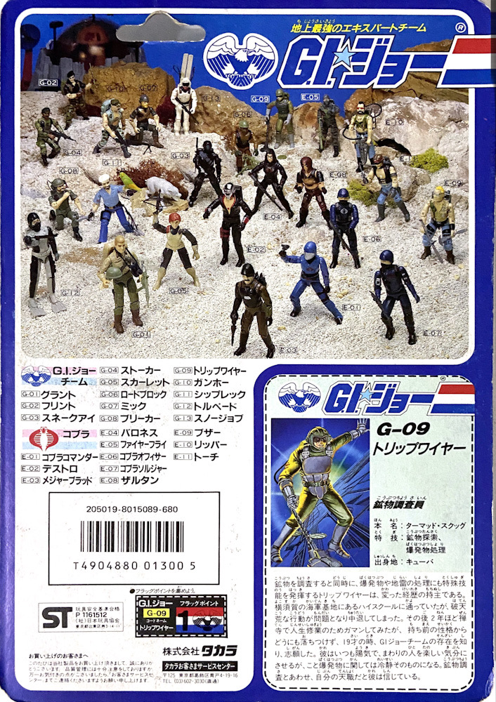 Tripwire é especialista tanto em detecção de minas quanto em desativação de explosivos e minas terrestres. Ele tem um histórico peculiar: frequentou o ensino médio em uma base naval americana em Yokosuka, Japão, mas acabou sendo expulso por má conduta e comportamento problemático. Mais tarde, passou um ano em um templo tentando buscar iluminação e paz interior, mas sua personalidade agitada o impediu de se adaptar. Ao descobrir a existência da equipe G.I. Joe aos 19 anos, decidiu se alistar com entusiasmo. É um sujeito sempre alegre, que anima quem está à sua volta, mas se transforma completamente ao lidar com explosivos — tornando-se frio, focado e meticuloso. Ele acredita firmemente que nasceu para fazer esse trabalho.