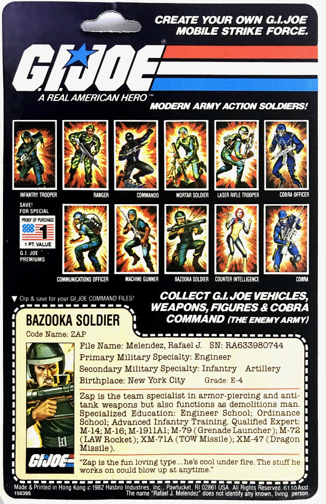 Zap é especialista em armamento e armas anti-tanque, mas também trabalha como homem de demolição. Educação Especializada: Escola de Engenharia; Escola de Ordenanças; Treinamento Avançado de Infantaria. Perito Qualificado: M-14; M-16; M-1911A1; M-79 (lançador de granadas); M-72 (Foguete LAW); XM-71A (míssil TOW); XM-47 (Míssil Dragon).